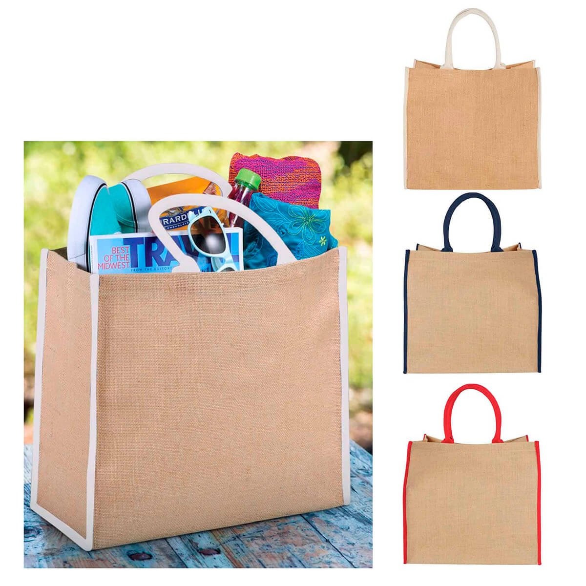 Rummelig og robust jute shoppertaske i naturlig Jute med farvet kantbånd